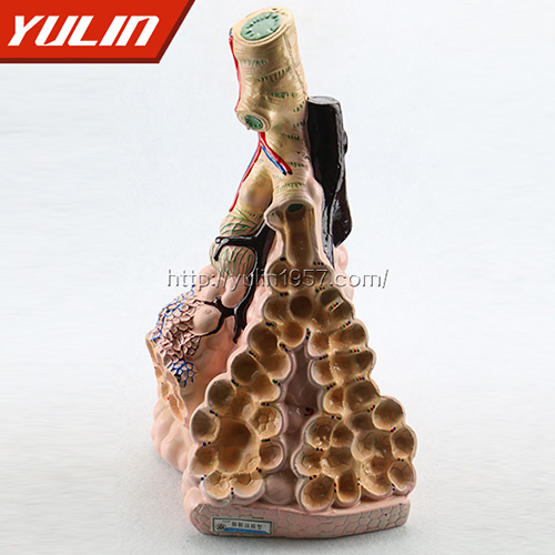 模型一侧肺泡管做纵断面,示肺泡囊、肺泡、肺泡结节、肺泡隔的剖面结构,另一侧肺泡囊示其横断面的结构。